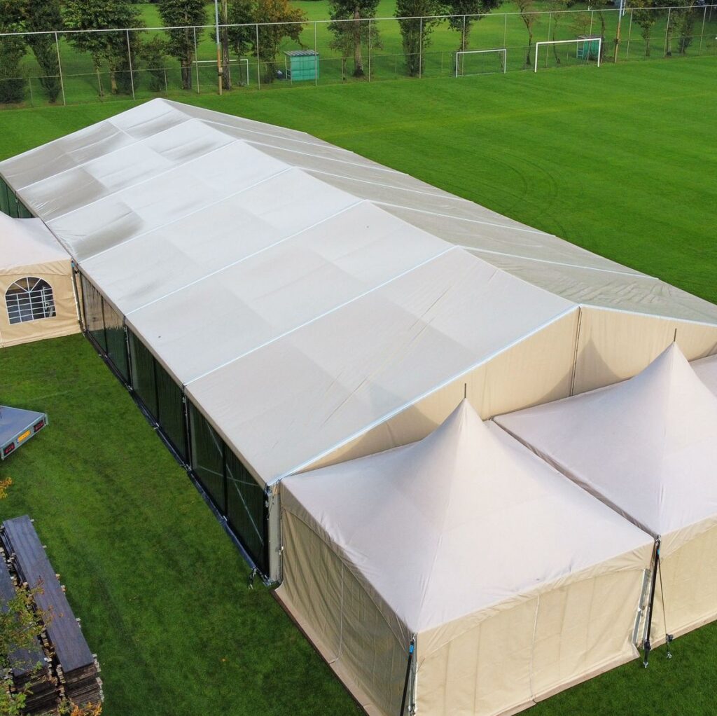 Het voordeel van een Aluhal is dat deze vanaf een standaardmaat van 10×5 meter te huren is en eventueel per 5m verlengd kan worden. Bij TentBro’s hebben we een de mogelijkheid om 3 aluhallen te bouwen van tot een maximale totale lengte van 50m. De zandkleurige Aluhallen zijn perfect te combineren met onze stretchtenten of pagodetenten.